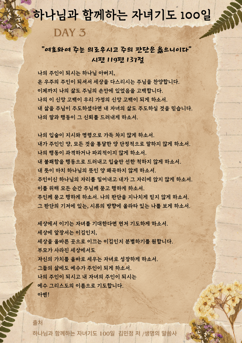 세상에는 수많은 가치들이 홍수처럼 밀려와서 가끔은 중심을 잡기가 힘들어서 휘둘릴 때가 있었음을 고백합니다. 세상의 가치에 맞서기 위해서 우리의 주도를 주님께 내어드리며 기독교적 세계관으로 무장하여 올바로 서서 자녀들을 올바른 가치로 이끄는 부모가 되기를 소망합니다.