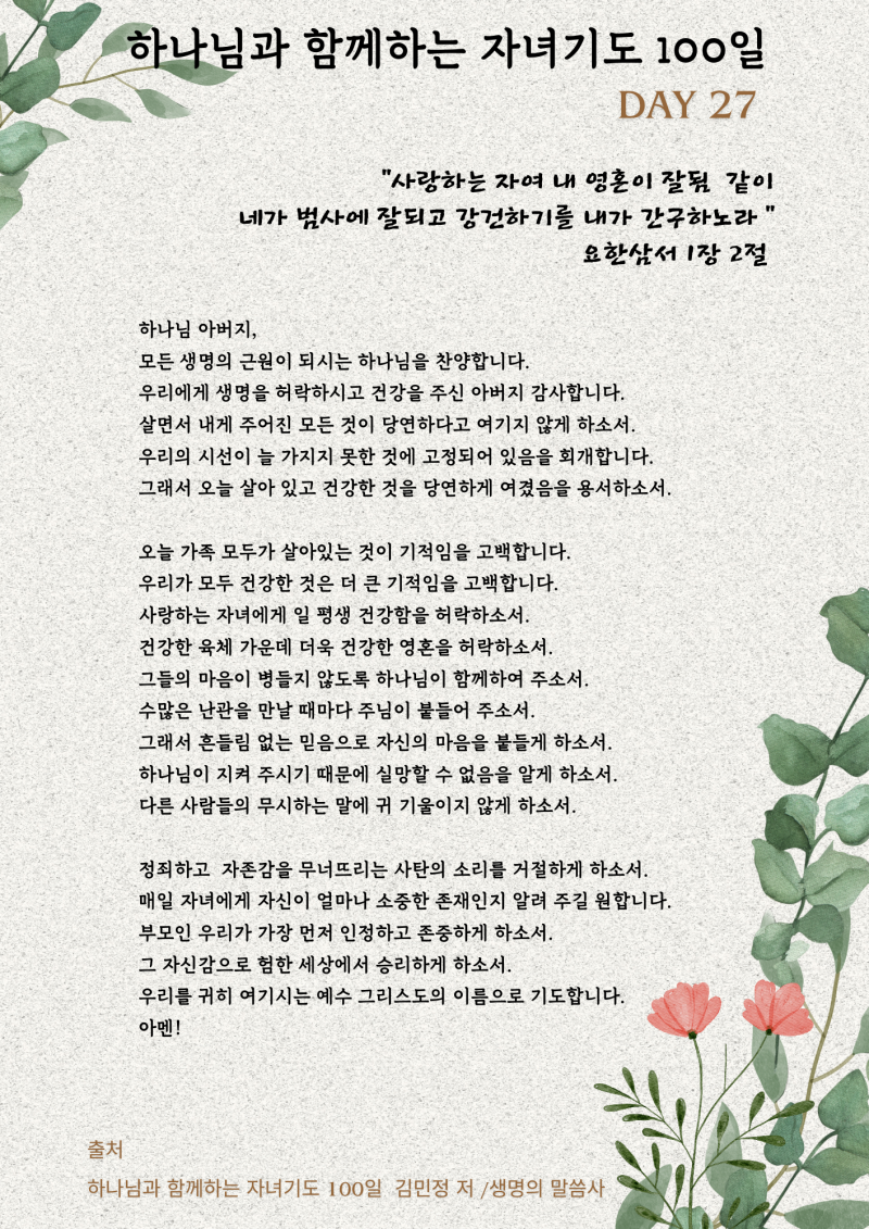 지존자의 은밀한 곳에 거주하며 전능자의 그늘 아래에 사는 자여(시 91:1)주어진 모든 것이 당연하다 여기지 않게 하소서. (김진아 사모)