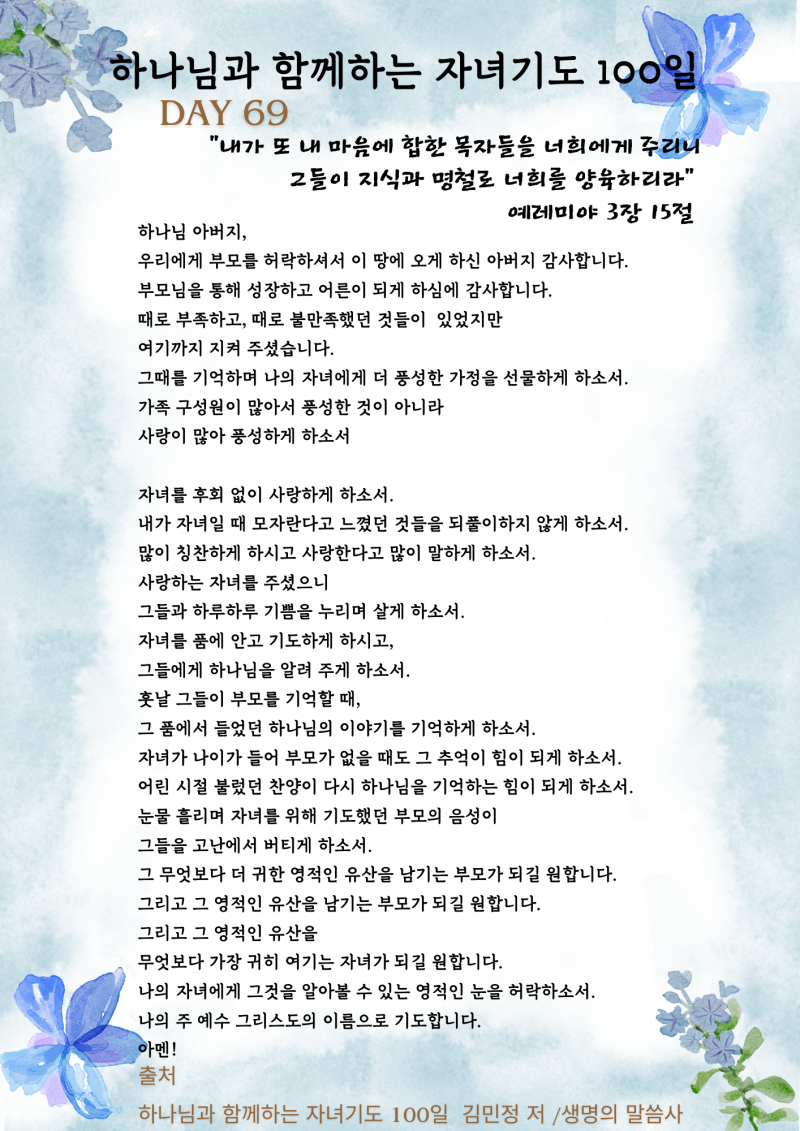 « Previous <하나님과 함께하는 자녀기도 100, Day 68> <하나님과 함께하는 자녀기도 100, Day 70> Next »